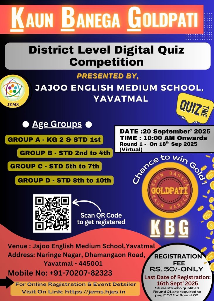 đ Jajoo English Medium School, Yavatmal is organizing KBGâ 2025 â District Level Digital Quiz Competition for students.